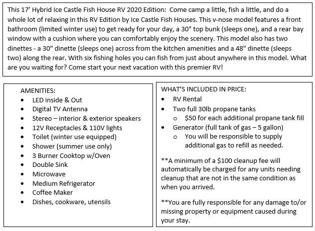 The 8’ x 17’ Ice Castle Hybrid RV: (sleeps 4)